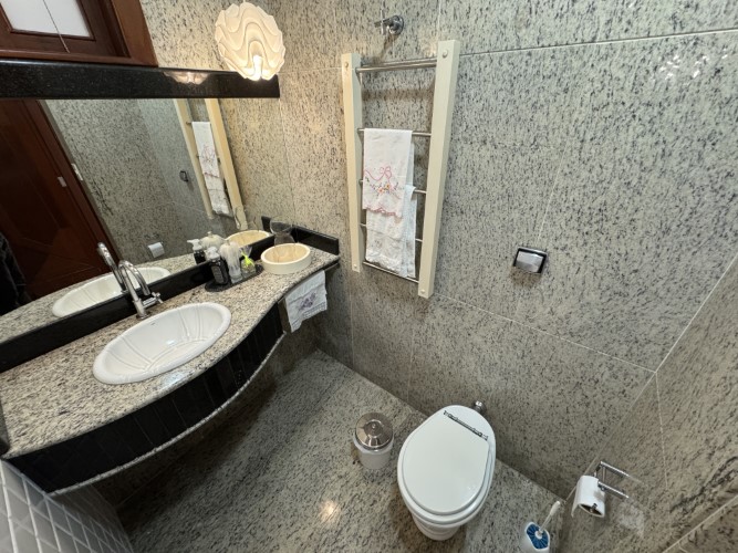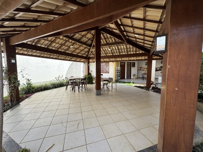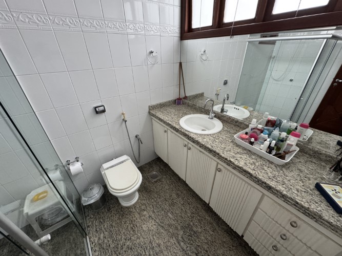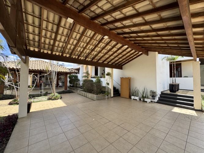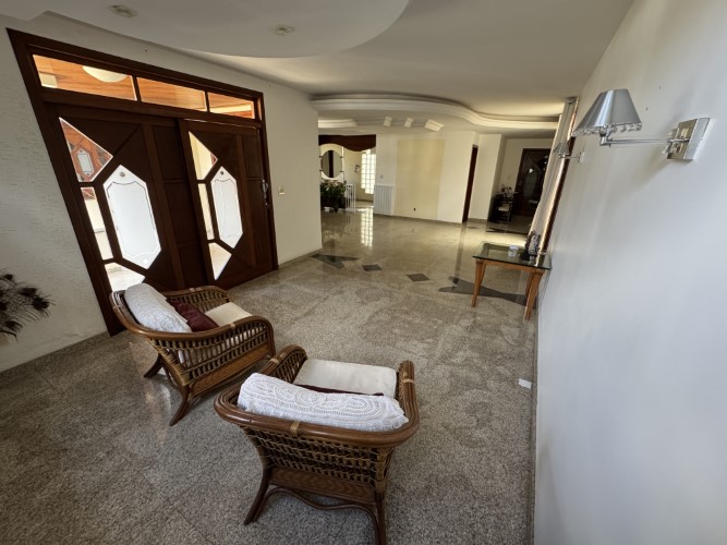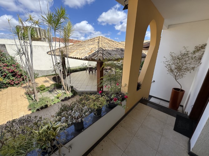 A residência impressiona pela amplitude e funcionalidade de seus ambientes. No térreo, dispõe de um belo jardim, área gourmet (com sauna), varanda, hall de entrada, sala para 02 ambientes, sala de TV (com lareira), 02 suítes, escritório, 02 áreas de luz, lavabo e espaço para roupeiro. A cozinha é acompanhada por despensa e área de serviço (com banheiro), além de um amplo quintal ajardinado, depósito, dependência (com sanitário) e 03 vagas de garagem.