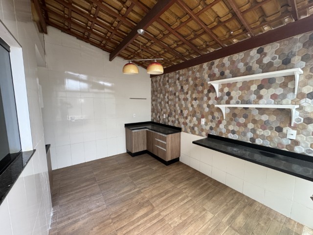 O imóvel dispõe de sala, 3 quartos (todos mobiliados com armários), sendo 1 suíte, banheiro social (com armário), hall de circulação que dá acesso à cozinha (com armários), cozinha adaptada para área gourmet (com armários), quintal, área de serviço (com escada de acesso ao sótão da residência) e 2 vagas de garagem cobertas na parte frontal da casa.