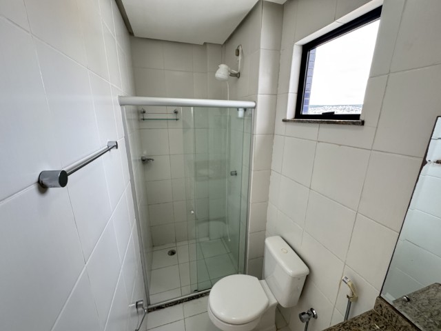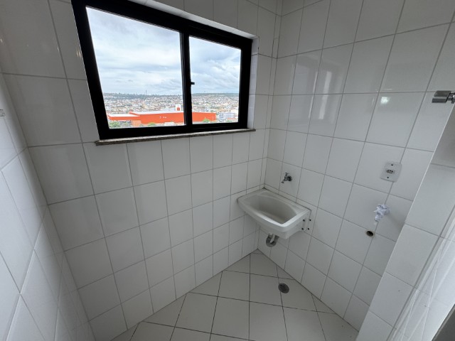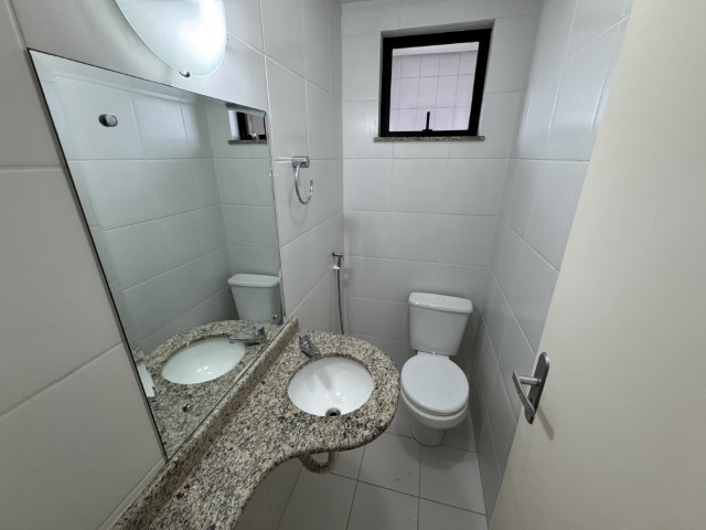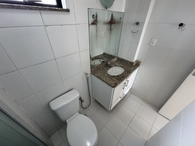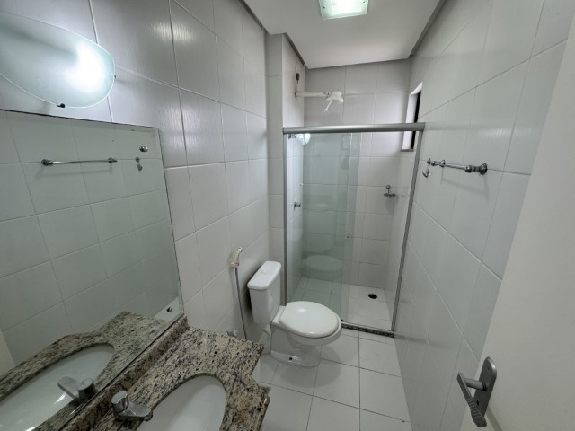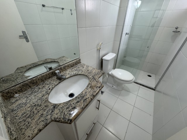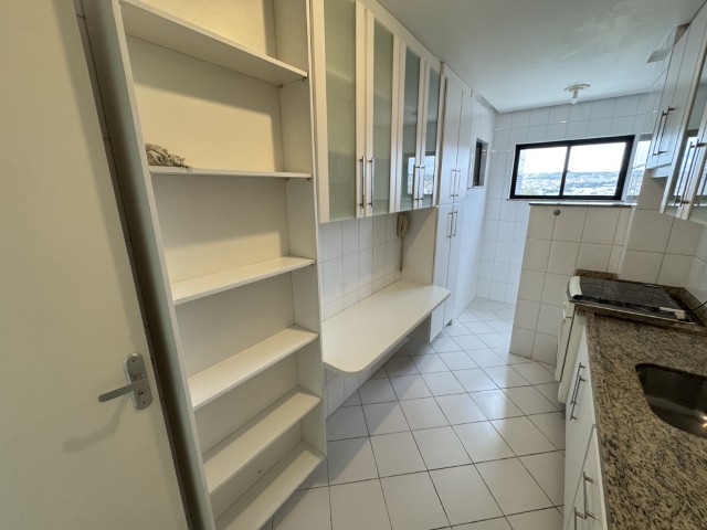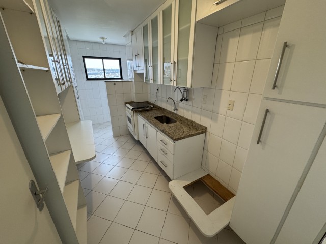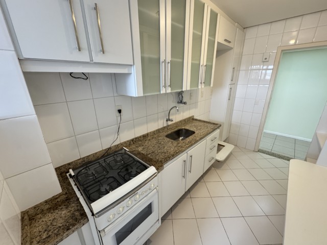 O apartamento dispõe de sala para 02 ambientes, com janela ampla que proporciona boa iluminação natural (com persianas), 02 suítes (ambas com persianas e armários nos banheiros, sendo 01 suíte composta com guarda-roupa), lavabo, cozinha (com armários e fogão), área de serviço e 01 vaga de garagem.