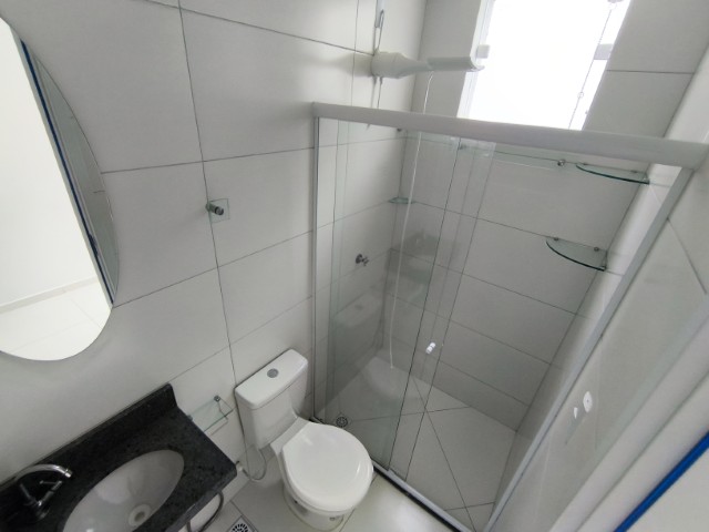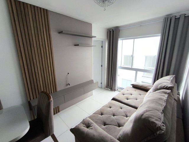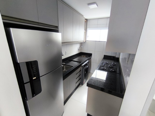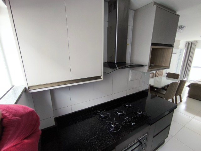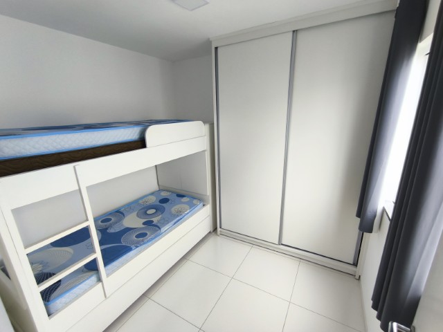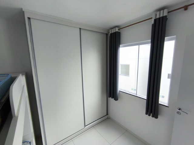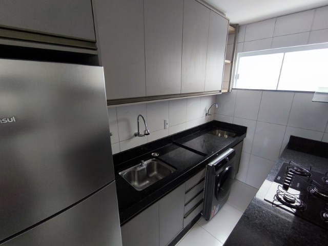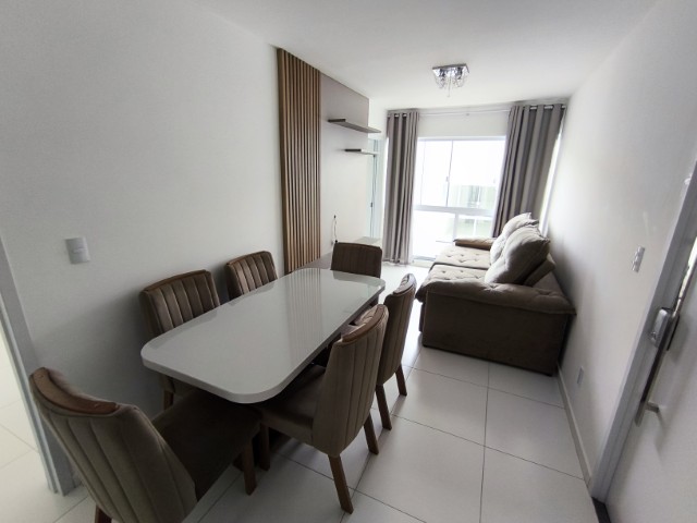 O imóvel dispõe de sala (com mesa para 6 lugares, sofá, painel de TV e cortina), 2 quartos (1 mobiliado com triliche, guarda-roupa e cortinas), sendo 1 suíte, banheiro social, cozinha integrada com área de serviço (com geladeira, armários planejados, cooktop, forno, sugar e máquina de lavar roupas) e 1 vaga de garagem.