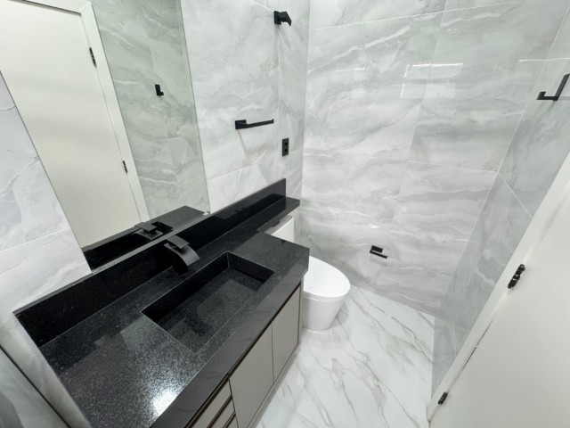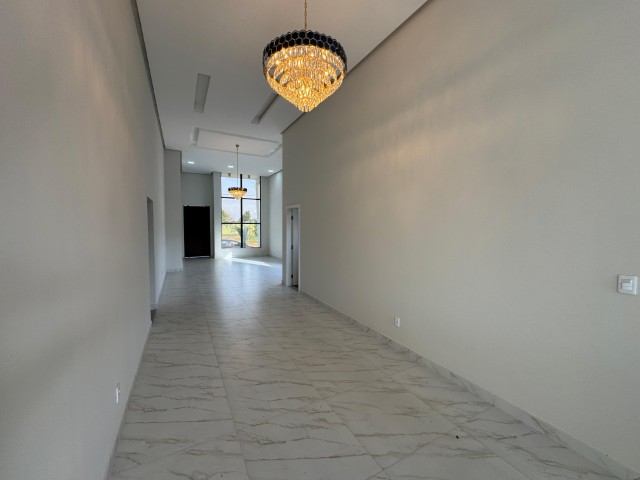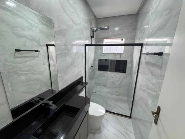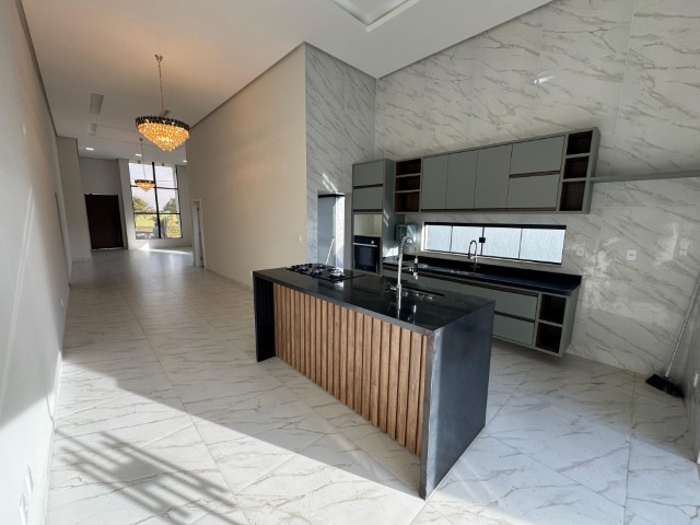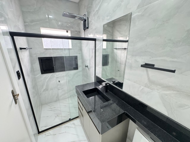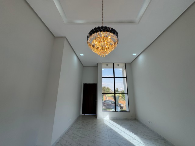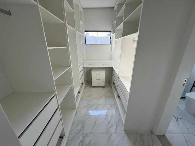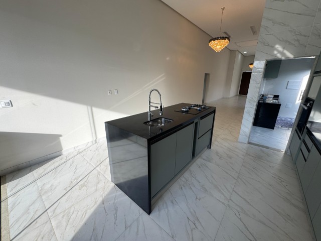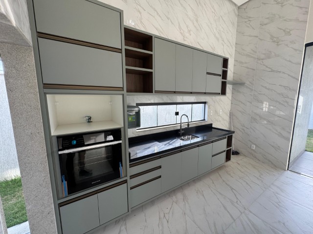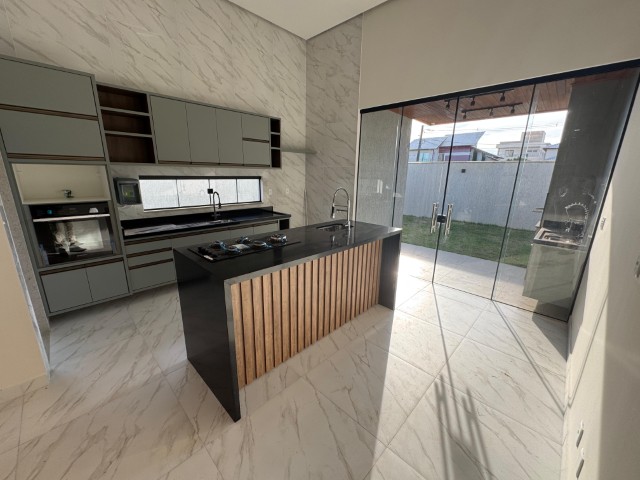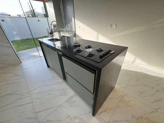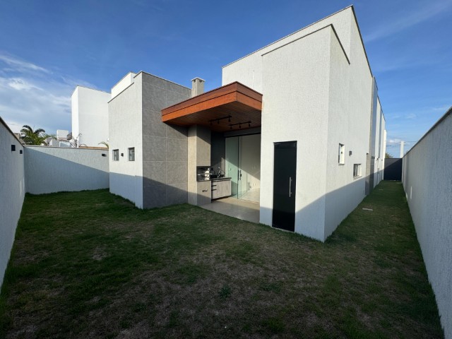 O imóvel dispõe de 02 salas, sendo a principal com janela do chão ao teto, o que proporciona excelente iluminação natural, 03 quartos, todos suítes (com armários nos banheiros, incluindo uma suíte com closet completo com armários planejados), lavabo, cozinha (equipada com armários planejados, forno e cooktop), área de serviço, banheiro de serviço e área externa com espaço gourmet (com churrasqueira) e quintal. A parte frontal da casa possui garagem coberta para 02 veículos.